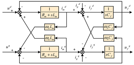 Based on the above analysis and according to Equations (3) and (4), the equivalent block diagram of the model of the inverter system under the two-phase synchronous rotating coordinate system is obtained in
