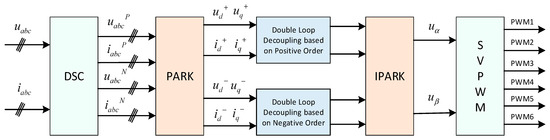 Figure 6. The positive and negative sequence separation double-loop decoupling control strategy based on a double rotating coordinate system realizes zero steady-state error regulation of the positive sequence and negative sequence components of the output voltage of the three-phase inverter, thus eliminating the output voltage imbalance caused by an unbalanced load. This is essential for maintaining the symmetry of the power output.