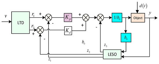 LADRC can be divided into linear and nonlinear and is composed of a linear tracking differentiator (LTD), linear extended state observer (LESO), and linear state error feedback control law (LSEF). The LTD can track the input signal of the system quickly without overshooting and can give a good differential signal; the LESO can estimate the state and disturbance of the system; the LSEF is used to obtain the control quantity, which is often simplified to the design of PD combination.