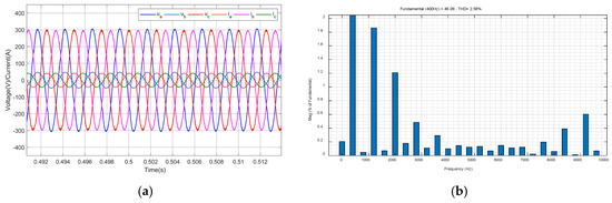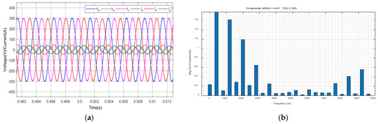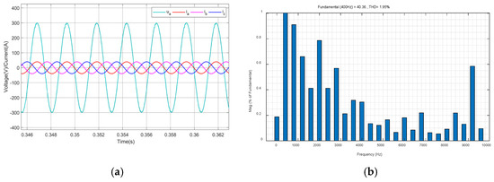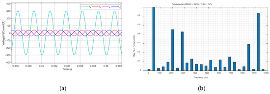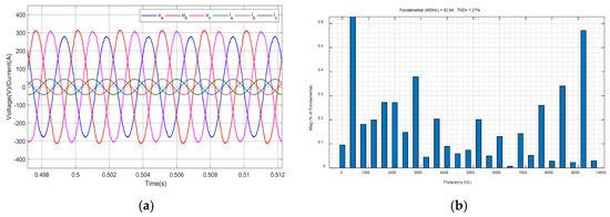 In Equation (18), is defined as the number of sampling points per fundamental period, where (sampling frequency) and (output frequency). The theoretical value is = 10,000/400 = 250, but = 200 is chosen to reduce the computational load in embedded control hardware, as higher values increase memory usage and delay compensation complexity, and represents the internal model coefficient. In order to stabilize the internal model, is usually taken as a constant slightly less than 1 or a low-pass filter with a gain of less than 1.