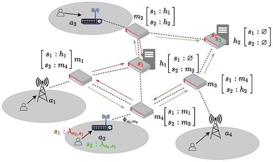 Given the presence of a flow table tensor for the system, it is possible to identify the target device for the service emanating from the edge device v by using . This representation is signified by and is an element of the set . By analyzing , we can obtain a set of routing paths ). These routing paths indicate the order of nodes that a request visits for service :