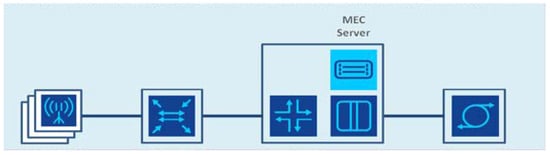 For instance, a simple MEC-based crowd sensing service system in a smart city project with two different services ( and ), four access points (–), and six edge devices (– and –) is shown in Figure 2. In this case, the MEC architecture follows the European Telecommunications Standards Institute (ESTI) reference (https://portal.etsi.org/, accessed on 8 February 2024) as Figure 3, where the MEC servers (edge servers) act as filters to hand the data flows from the mobile device to the cloud. Because not all edge devices are adequate to become edge servers [,,], here only and are selected.