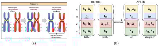 Figure 4. (a) An illustration of chromosome crossover in biology and (b) an illustration of the crossover of two solutions in GA4QST.