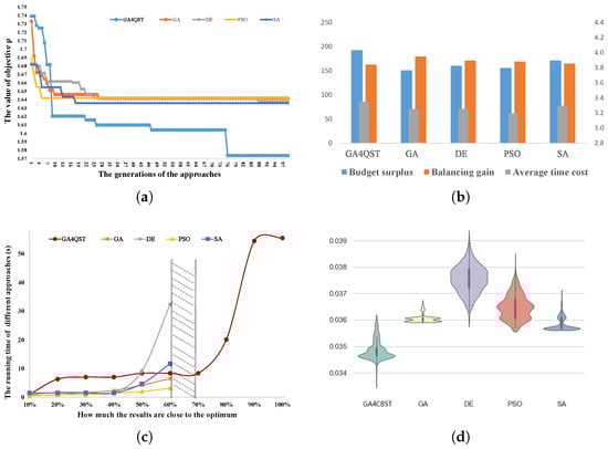 To assess the resilience of the proposed algorithm, 1000 independent runs were conducted for each algorithm. The results are presented as a violin graph in Figure 5d. The violin plot is a method for visualizing continuous data, showcasing the distribution of the objective function values across different algorithms after 1000 independent runs. A smaller value of the objective function indicates a better tradeoff between system performance and cost. In the violin plot, the white dot represents the median, reflecting the central tendency of the data. The width of the violin plot corresponds to the density of the data distribution for each algorithm; wider regions indicate higher frequencies of results within that range, suggesting greater fluctuations in outcomes across multiple experiments. Notably, GA4QST exhibits remarkable ability to reach the optimum solution. Compared to the baselines, the violin graph for GA4QST is narrower and more concentrated in the lower-value region, indicating that the algorithm consistently achieves near-optimal solutions across most runs. The medians of the baseline algorithms are significantly higher than the median of GA4QST; even the SA algorithm, which exhibits the best robustness among the baselines, has a median value higher than GA4QST. These results further confirm the effectiveness and potential applicability of GA4QST in real-world scenarios.