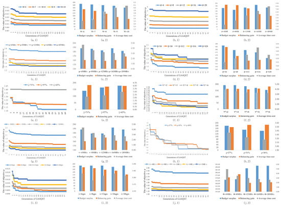 Figure 6. Under different system parameters, the impact on the proposed GA4QST algorithm is as follows: (a) Under different numbers of services W: 1. Changes in the objective function value of the GA4QST; 2. Changes in different indicators within the objective function of the GA4QST; (b) Under different service request data volumes d: 1. Changes in the objective function value of the GA4QST; 2. Changes in different indicators within the objective function of the GA4QST; (c) Under different edge server processing capabilities : 1. Changes in the objective function value of the GA4QST; 2. Changes in different indicators within the objective function of the GA4QST; (d) Under different edge server deployment costs : 1. Changes in the objective function value of the GA4QST; 2. Changes in different indicators within the objective function of the GA4QST; (e) Under different edge server densities : 1. Changes in the objective function value of the GA4QST; 2. Changes in different indicators within the objective function of the GA4QST; (f) Under restrictions on the maximum number of service instances per server : 1. Changes in the objective function value of the GA4QST; 2. Changes in different indicators within the objective function of the GA4QST; (g) Under different wireless transmission rates v: 1. Changes in the objective function value of the GA4QST; 2. Changes in different indicators within the objective function of the GA4QST; (h) Under different edge server connection densities : 1. Changes in the objective function value of the GA4QST; 2. Changes in different indicators within the objective function of the GA4QST; (i) Under different service request arrival rates : 1. Changes in the objective function value of the GA4QST; 2. Changes in different indicators within the objective function of the GA4QST; (j) Under different communication qualities of edge devices : 1. Changes in the objective function value of the GA4QST; 2. Changes in different indicators within the objective function of the GA4QST. - (2)
