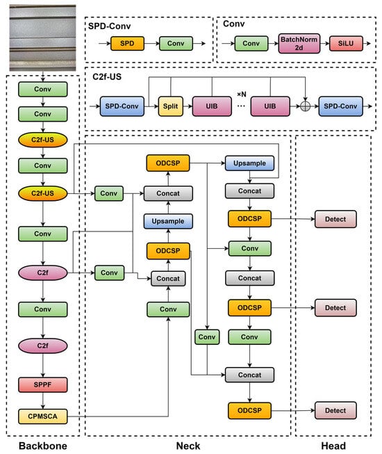 As shown in Figure 1, in the backbone network, YOLO-AL integrates two new and improved modules, C2f-US and CPMSCA. C2f-US is employed to replace the initial two C2f layers of the backbone network, with the objective of optimizing feature extraction while ensuring model lightweighting. CPMSCA is incorporated at the end of the backbone network as an attention mechanism to enhance the model’s capacity for capturing complex and strip-like features. In the neck network, ODE-RepGFPN is introduced to replace the entire original neck network, optimizing the model’s ability to capture high-level semantic and low-level spatial information. Finally, FW-IoU is introduced to replace the original loss function, addressing the challenges of dataset imbalance and hard sample mining. Table 2 provides a clearer visualization of the modular and architectural enhancements implemented in this study.