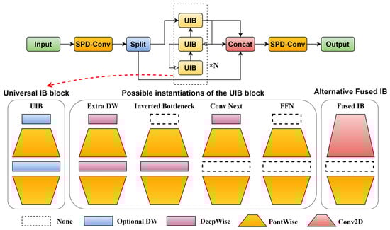 Schematic representation of the C2f-US and UIB structures. The upper portion illustrates the C2f-US architecture, while the lower portion depicts potential instantiations of the UIB block.