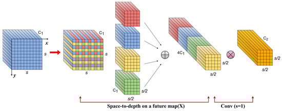 where f denotes the feature designator, X represents the subfeature map, and the expression within the following brackets describes the method by which the subfeature map is obtained. Specifically, the contents within the brackets are separated by commas, indicating the feature extraction methods along the x- and y-axes, respectively. Each part consists of three parameters: the starting point, the ending point S, and a step size of scale for the intercept. In this study, scale = 2 is selected to prevent overfitting of the features. The SPD-Conv principle is shown in Figure 3.