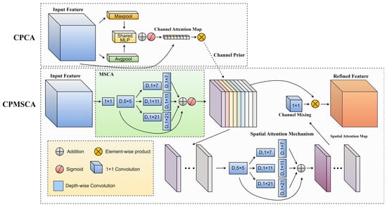 Obtaining high-resolution images of aluminum in typical industrial environments is considered difficult, which results in the features of aluminum damage not being evident in the photographs. This necessitates advanced feature extraction capabilities and effective information aggregation within the model to accurately detect and classify defects. Traditional channel and spatial attention mechanisms have been proven effective in enhancing the discriminative capacity of feature representations. However, when modeling cross-channel dependencies, dimensionality reduction often hampers deep visual representation learning, leading to a failure to detect certain features or defects. To address these issues, Channel Prior and Multi-Scale Convolutional Attention (CPMSCA) was proposed, which was inspired by Channel Prior Convolutional Attention (CPCA) [30] and Multi-Scale Convolutional Attention (MSCA) [31].