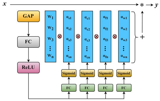 ODConv is a four-dimensional convolution that dynamically tunes the convolution kernel parameters in four orthogonal dimensions through a multidimensional dynamic attention mechanism. The four dimensions are the spatial dimension, input channel dimension, output channel dimension, and kernel dimension. The enforcement principle of the ODConv module is illustrated in Figure 5.