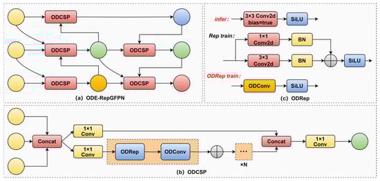 ODE-RepGFPN structure schematic: (a) ODE-RepGFPN network structure; (b) ODCSP structure; (c) ODRep structure.