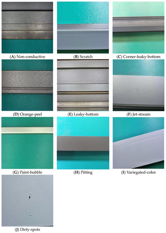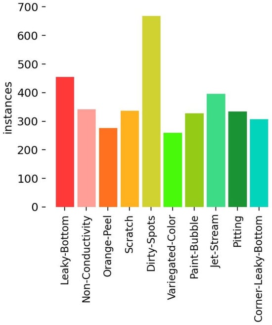 This paper utilizes the aluminum defect dataset from the Aliyun Tianchi competition, known as APDDD (Aluminum Profile Surface Detection Database), which encompasses a diverse set of aluminum damage types collected during manual defect inspection procedures. APDDD contains 10 aluminum damage types: non-conductive, scratch, corner-leaky-bottom, orange-peel, leaky-bottom, jet-stream, paint-bubble, pitting, variegated-color, and dirty-spots. Each defect type is represented by images with a resolution of 640 × 640, as illustrated in Figure 8A–J. In the assessment of aluminum surface damage, the most significant types of damage are loss of electrical conductivity, abrasion, scuffing, surface bottom leakage, paint blistering and pitting. These issues directly affect the performance, safety and service life of the material, and therefore warrant particular attention. As demonstrated in Figure 9, the visualization image shows the distribution of the dataset.