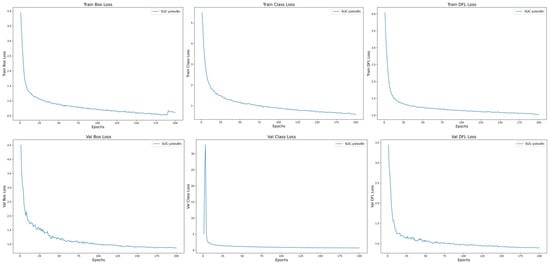 As depicted in Figure 10, the loss metrics of the YOLO-AL model show a continuous decline with increasing iterations, stabilizing before 200 epochs. This indicates ongoing optimization throughout training, leading to improved model fitting capabilities. Train Box Loss denotes the bounding box loss curve for the training set, Train Class Loss represents the target loss curve, and Train DFL (Distribution Focal Loss) indicates the classification loss curve. Similarly, Val Box Loss, Val Class Loss, and Val DFL Loss represent the corresponding loss curves for the validation set. The x-axis represents the number of iterations, and the y-axis corresponds to the loss values.