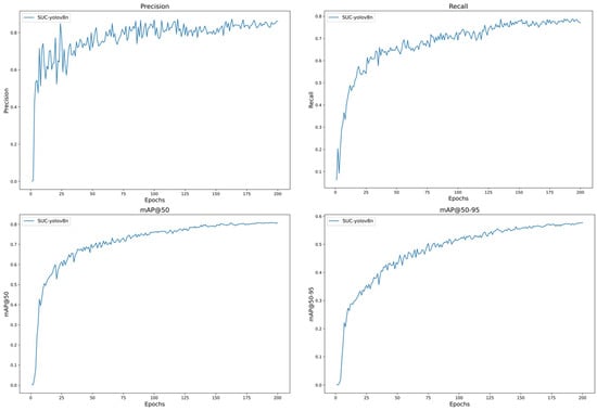 Figure 11 illustrates the variation curves of the YOLO-AL model for precision and recall and mAP over 200 training cycles. Specifically, the precision curve, the recall curve, and the mAP@0.5 curve and the mAP@0.5:0.95 curve, whose horizontal coordinates are the number of iterations and whose vertical coordinates are the values of precision, recall, mAP@0.5, and mAP@0.5:0.95, respectively. As is evident from Figure 11, the evaluation indexes of the model tend to increase and have stabilized by cycle 200 without overfitting. In summary, the convergence of the model in this paper is satisfactory, and the selection of 200 training cycles is appropriate.