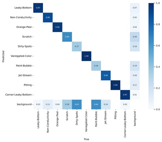 The confusion matrix serves as a graphical representation of the misclassification distribution across different categories. The intensity of the diagonal color gradation corresponds to the prediction accuracy, with darker hues indicating higher accuracy in classification. Figure 12 presents the confusion matrix of YOLO-AL, demonstrating that the optimized model achieves detection accuracy exceeding 85% for most aluminum damage and defects. Notably, for two distinct categories of damage, namely variegated-color and pitting, the model demonstrates an exceptional capacity, attaining an accuracy of 100%. However, the detection accuracy for damage types such as paint-bubble is comparatively lower, at approximately 40%.