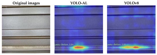 In this paper, Gradient-weighted Class Activation Mapping (Grad-CAM) [36] is utilized to visually compare the heatmaps generated by the model prior to and following the enhancement. As demonstrated in Figure 13, the red region in each plot indicates the region to which the model directs greater attention when performing the classification task. YOLO-AL focuses more attention on the detection box, as evidenced by the concentrated red regions, compared to the YOLOv8 model. In contrast, the heatmap of YOLOv8 exhibits more scattered red regions, failing to adequately highlight the critical features associated with aluminum damage. This suggests that the improvements made by YOLO-AL help to focus the model’s attention on the damage, which helps to improve model accuracy and the ability to detect the location of defects. Consequently, this suggests that YOLO-AL may possess a greater capability to surpass YOLOv8 in more challenging damage classification scenarios.