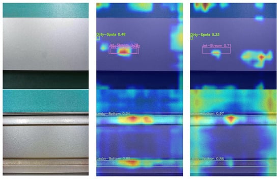 According to the detection results in Table 5, the optimized YOLO-AL model in this paper shows a significant improvement in the detection of leaky-bottom (LB), non-conductivity (NC), dirty-spots (DS), paint-bubble (PB) and jet-stream (JS), while for defects leaky-bottom, orange-peel (OP), variegated-color (VC), pitting (PI) and corner-leaky-bottom (CL) all have over 95% mAP values. This result fully demonstrates that the YOLO-AL model optimized in this paper is well adapted to most of the defects and shows the highest accuracy in the detection of leaky-bottom, non-conductivity, dirty-spots, paint-bubble and jet-stream. However, YOLO-AL, like all other models, exhibits limited detection accuracy for paint-bubble (PB) defects. Analysis reveals that PB defects are extremely small on the aluminum surface, covering only a few tens of pixels. This presents a significant challenge for the model’s small-object detection capability and highlights a key area for further enhancement.