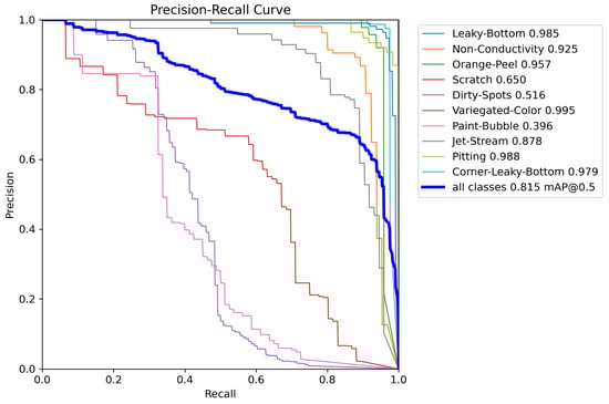 To further illustrate the effect of the YOLO-AL detection categories, the precision–recall (PR) curve is plotted in this paper. Figure 14 presents the PR curve for YOLO-AL. A larger area enclosed by the PR curve and the axes indicates superior model performance, reflecting an optimal balance between precision and recall. The observed results are consistent with the previous analysis.