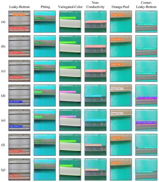 In the following study, we undertake a visual comparison and analysis of the effectiveness of five YOLO series algorithms and the enhanced algorithm of this paper (YOLO-AL (f)). This enhanced algorithm is employed for the detection of six defect types through visual methods (see Figure 15). The location and extent of the actual damage are indicated by (g). The investigation revealed that the YOLOv3-tiny (a), YOLOv5n (b), YOLOv8n (c), YOLOv10n (d), and YOLOv11n (e) algorithms were not effective in detecting aluminum damage. The experimental results demonstrate that the enhanced YOLO-AL model presented in this paper exhibits the optimal detection efficacy. Notably, in scenarios involving defects such as leaky-bottom and variegated-color, the detection confidence attained a maximum of 100%. In summary, the newly developed algorithm YOLO-AL demonstrates remarkable performance.