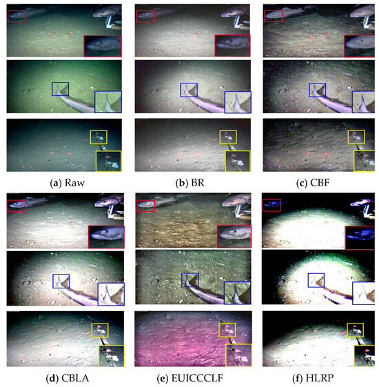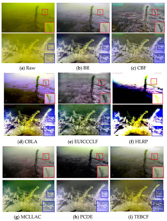 Experimental environment and parameter settings: All the experiments are tested using MATLAB 2020a software on a 2024 Redmi Book Pro 16 computer configured with Ultra 5 3.1K 165Hz DCI-P3 32G 1T. With this experimental environment established, we now turn to the parameter settings of our method. Taking into account both the image-enhancement effect and computational efficiency, the primary parameter settings for our method are outlined as follows: the transformation coefficient is , and is fixed to 1 in Equation (7) to produce the globally enhanced sequence; the guided filter parameter is set to in Equation (10) to obtain the detail-enhanced image; the decomposition level is , and the radius is for the SWF-based multi-scale decomposition in Equation (11) to produce the LF image and HF images; the parameter is set to in Equation (13); the parameter is set to in Equation (15); and the size of patch is in Equation (16). Using the aforementioned parameters, the proposed method exhibits good enhancement effects across a diverse array of real-world underwater scenarios.