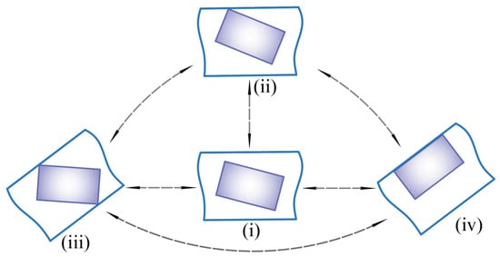 Motion modes of translational clearance are mainly divided into four situations; the motion mode of translational clearance is shown in Figure 2. The slider is in a free state without any collision phenomenon, as shown in Figure 2(i); a corner of the slider collides with the guide rail surface, as shown in Figure 2(ii); the diagonal of the slider collides with the guide rail surface, as shown in Figure 2(iii); and the same side of the slider collides with the guide rail surface, as shown in Figure 2(iv).