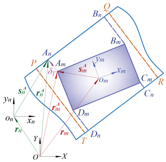 Establishing an effective contact detection model is one of the key aspects of this study, as the clearance between the moving pair can cause contact collisions between the slider and guide rail. Figure 3 shows the contact detection model, which divides the clearance of the moving pair into two parts: slider m and guide rail n. Am, Bm, Cm, and Dm are potential contact points on the slider, and An, Bn, Cn, and Dn are four corner points of the guide rail. Unit normal vector nT is set to [1, 0]T, and the unit horizontal vector tT is set to [0, 1]T. Due to the vertical placement of the guide rail, the unit normal vector is perpendicular to the guide rail. Taking the contact detection of the slider corner point A as an example, there exists a geometric relationship as follows: