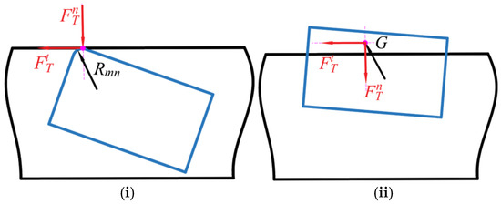When two adjacent corners of the slider come into contact with the guideway, contact force acts on the centroid of penetration area, as illustrated in Figure 4ii. The collision force can be expressed as