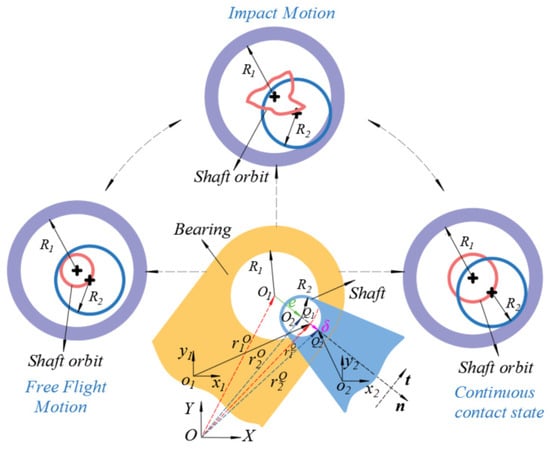 The clearance model of the rotating pair is shown in Figure 5. and are the bearing and shaft radius, respectively. and are the centers of the bearing and shaft, respectively. and are the collision points on the bearing and shaft, respectively. The eccentricity between shaft and bearing is