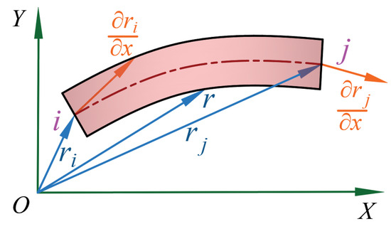 The flexible element is modeled by using the absolute node coordinate method, and a one-dimensional two-node element is applied to divide the flexible element. The model of the flexible beam element is shown in Figure 6. The position vector of any point could be written as