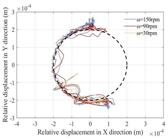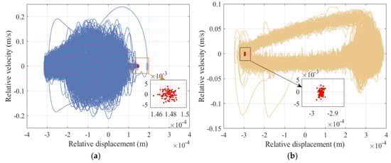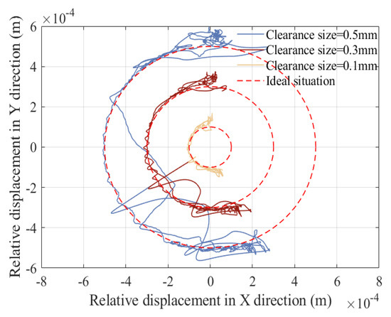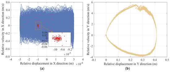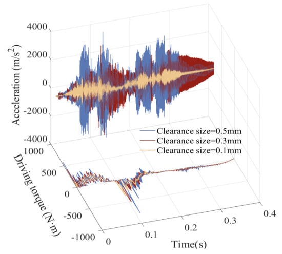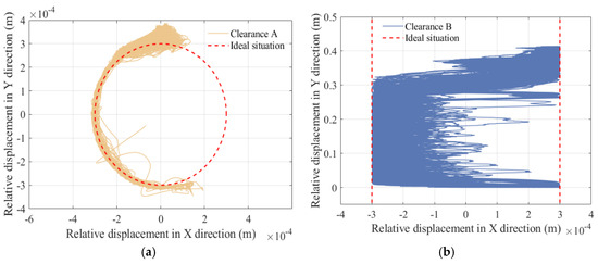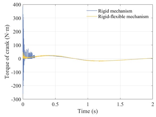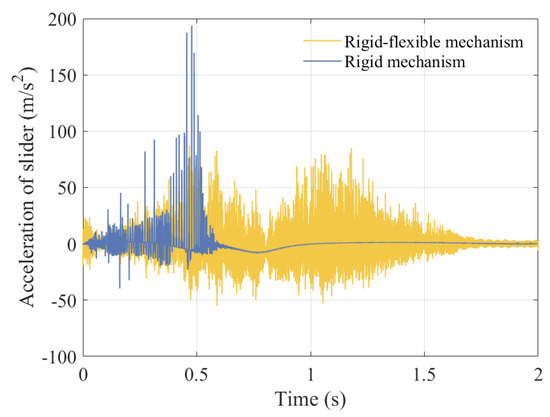 From the curve of slider displacement and velocity, it can be seen that the flexibility of the component has a relatively small impact on displacement, and velocity will produce a certain amount of small vibration. According to Figure 36 and Figure 37, the elastic deformation of the component causes high-frequency vibrations in the acceleration and torque curves, but the peak values decrease. According to the center trajectory of the clearance, it is found that when considering the elastic deformation of the component, the trajectories of the shaft and slider focus on one area for high-frequency vibration. The main reason is that the components undergo elastic deformation when subjected to force, which may cause deviations between the actual motion and ideal motion of the mechanism. Meanwhile, the flexible deformation of the components will consume some energy, resulting in a decrease in the energy transfer efficiency of the mechanism.