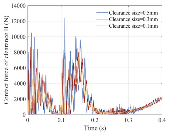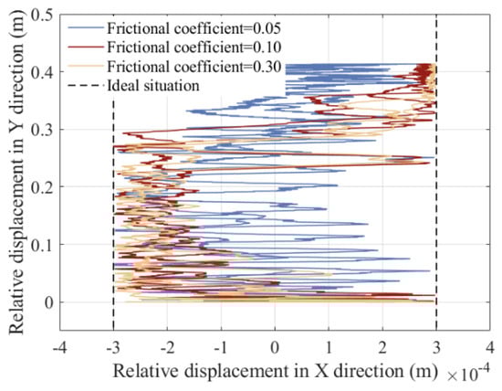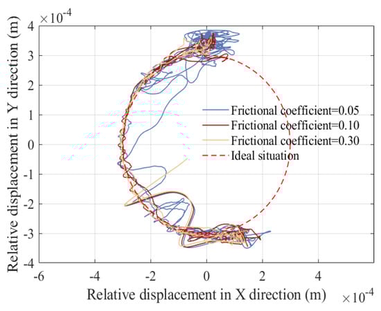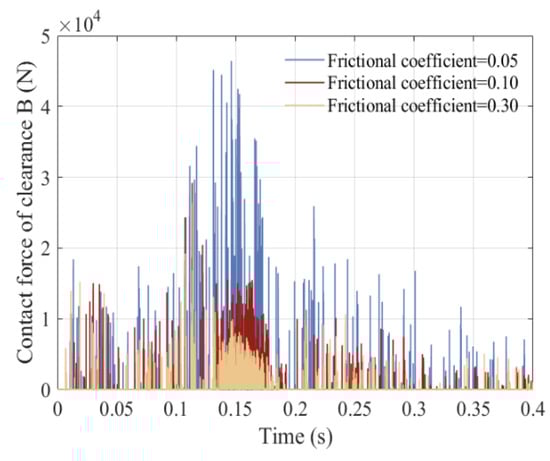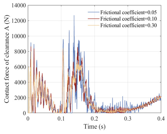 Due to the presence of nonlinear factors such as clearance between revolute pairs, clearance between translational pairs, and elastic deformation, changes in the frictional coefficients of a clearance pair can also affect its operational stability. So, in order to better describe the impact of frictional coefficients on the dynamics, displacement, and velocity of the slider, the acceleration of the slider and driving torque of crank, the contact force of revolute clearance A, the trajectory of revolute clearance A, the contact force of revolute clearance B, and the trajectory of revolute clearance B changing by frictional coefficient are studied, as shown in Figure 28, Figure 29, Figure 30, Figure 31, Figure 32 and Figure 33. The three selected friction coefficients are 0.05, 0.1, and 0.3. The operating speed of the mechanism is 150 rpm, and clearance values of the revolute pair and translational pair are 0.3 mm.