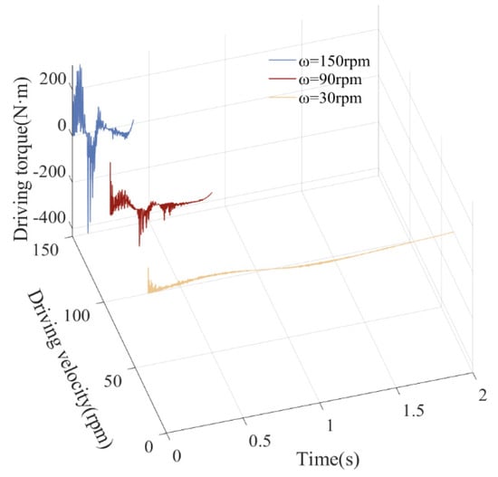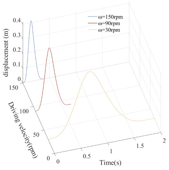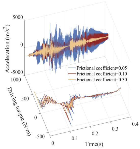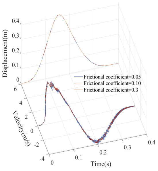 Friction has a significant impact on the dynamic characteristics of a mechanism. Friction converts the mechanical energy of a system into thermal energy, causing the energy of the system to gradually dissipate, thereby changing vibration characteristics. This energy loss has a significant impact on dynamic characteristics. Increasing the friction coefficient will further increase the frictional force, causing an increase in vibration damping and a gradual decrease in amplitude, thereby reducing the system’s output power and increasing its heat loss. According to the dynamic response diagram (Figure 28, Figure 29, Figure 30, Figure 31, Figure 32 and Figure 33), as the friction coefficient increases, vibration frequency and the amplitude of the mechanism’s dynamic weaken, and the mechanism gradually exhibits a stable motion trend.