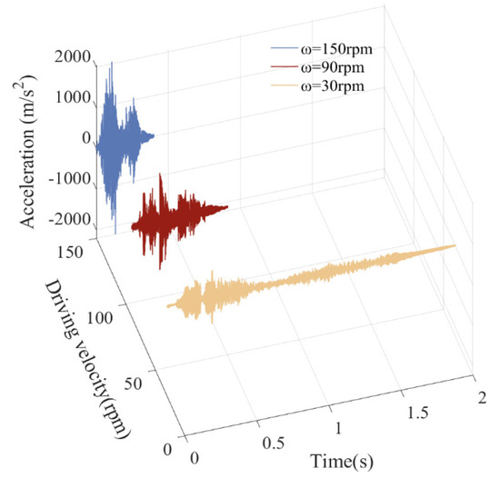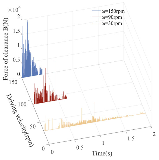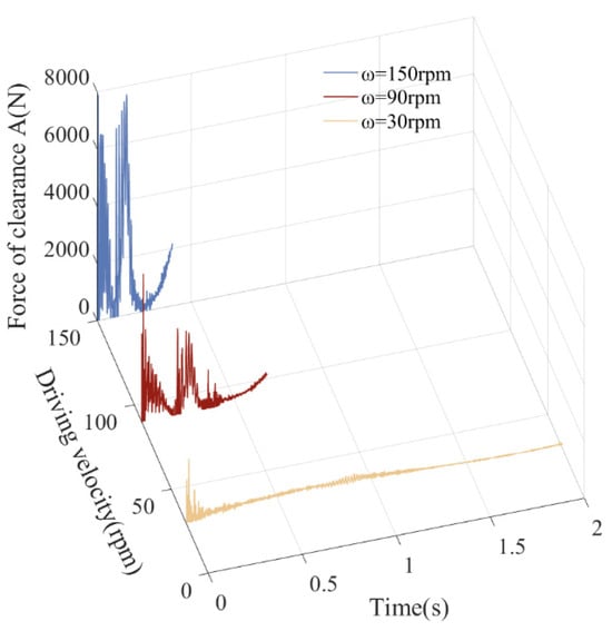 From the displacement curve, there is no significant fluctuation or vibration in the displacement curve, and the effect of changes in driving speed on displacement is relatively small. From curves of speed, acceleration, driving torque, and collision force at clearance, as driving speed increases, peak dynamic response also increases, and the mechanism becomes very unstable. Due to the faster running speed of the mechanism, the impact of revolute joint A and the impact of translational pair B become more severe, the fluctuation in the response is more significant, and the peak value also increases. The center trajectory of rotating clearance and translational clearance shows that when running speed increases from 30 rpm to 90 rpm, and then to 150 rpm, the degree of confusion in the trajectory increases, and the number of collisions between elements of clearance pairs increases.