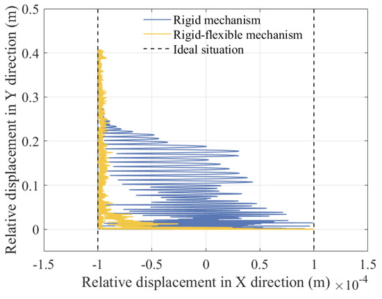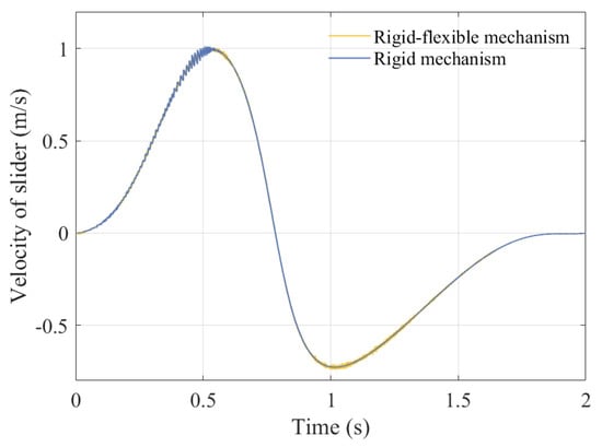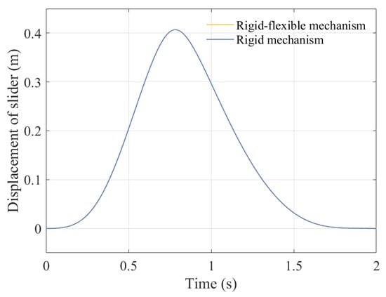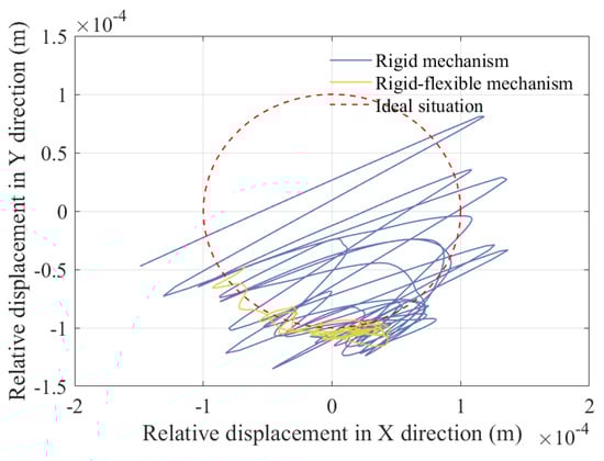The focus of this study is to simultaneously consider the coupling effects of rotating pair clearance, moving pair clearance, and component flexibility on the mechanism. Many studies have overlooked the influence of component flexibility. Therefore, this article adds a comparison of displacement, velocity, acceleration, and center trajectory between rigid mechanisms with clearance and rigid–flexible coupling mechanisms with clearance, as shown in Figure 34, Figure 35, Figure 36, Figure 37, Figure 38, and Figure 39, respectively.