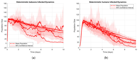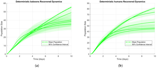 Modeling zoonotic disease transmission dynamics often involves both deterministic and stochastic approaches. Deterministic models provide a fixed, predictable outcome based on initial conditions and are useful for understanding baseline disease behavior. In contrast, stochastic models incorporate random fluctuations, allowing researchers to capture real-world uncertainties in disease spread due to factors such as environmental changes, resource availability, and variations in population behaviors [7,8]. For example, in the case of baboon–human interactions, stochastic elements enable a realistic representation of disease behavior by accounting for unpredictable events like seasonal changes and food scarcity that could amplify or reduce disease transmission [9]. The basic reproduction number is computed using statistical sensitivity indices to identify the influence of parameters like transmission and recovery rates on disease spread [10,11]. A reproduction number greater than one suggests persistent disease, while a value below one indicates eradication likelihood.