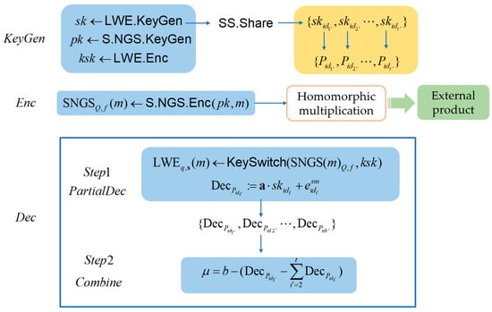In this section, we design a novel ThFHE using the S-NGS scheme—Th-S-NGS. ThFHE supports homomorphic operations on inputs from multiple data owners without sacrificing user priorities. The constructed ThFHE scheme needs to be combined with the CS-LISS scheme to realize the threshold access structure. For this purpose, all parties encrypt the data using a key issued by a trusted third party, and decryption only requires participants to agree and cooperate in decrypting any ciphertext, without requiring all participants to join.