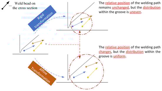 Figure 10 compares rigid transformation (rotation/translation) with affine projection results. Rigid transformations fail to accommodate groove shape changes, while affine projection maintains bead pattern similarity. The specific implementation steps of the algorithm are as follows.