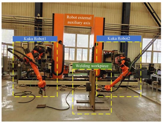 Figure 15. The traveling mechanism is composed of two 9-degrees-of-freedom KUKA-R1610 manipulators from KUKA Robotics (Shanghai) Co., Ltd., Shanghai, China, with the workpiece placed in the middle position between the two robots. During actual welding, the two robots perform double-sided welding simultaneously. The selected handheld scanner is the ZhongGuan Scan 717 from Wuhan ZhongGuan Automation Technology Co., Ltd., Wuhan, China, featuring a scanning accuracy of 0.03 mm, as illustrated in