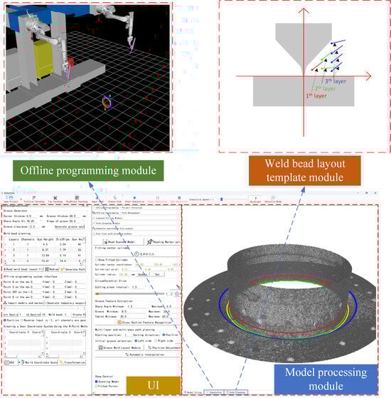 The offline programming system V1.0 was independently developed using C++ and Qt, integrating functions of model preprocessing, STL model slicing, groove feature recognition, and multi-layer multi-pass arrangement. As illustrated in