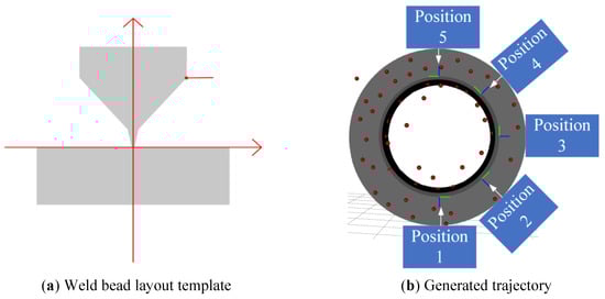 Figure 19. Following that, the STL model’s topological structure was reconstructed, and cutting planes were generated at 1° intervals around the branch pipe’s central axis. Geometric feature points of the groove were identified on the sliced cross-sections, and a bead layout template was designed in the planar space. Welding paths were generated via projective transformation, with the template and path label points illustrated in