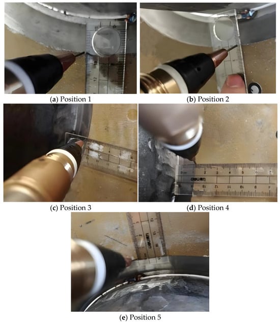 To validate system accuracy, a robot motion trajectory is created along the groove perimeter, where the welding torch’s advancing direction is normal to the cutting plane and its axis is perpendicular to the groove surface. The trajectory transitions from the groove base to the top, rotating 180° around the central axis. Five equally spaced detection points are positioned at 6 o’clock, 4:30, 3 o’clock, 1:30, and 12 o’clock orientations along the path. At each specific position of the manipulator, the distance from the tool tip to the workpiece perimeter is measured. The planned trajectory and detection point layout are illustrated in
