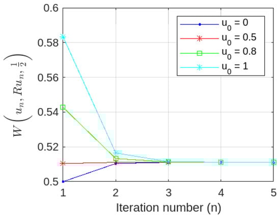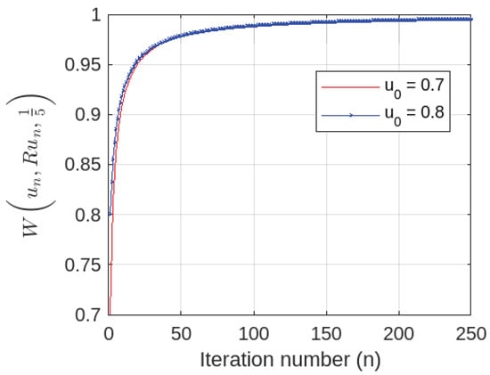 Therefore, by Theorem 1, , where is the unique fixed point of mapping Since for all , the existence of a solution for cannot be checked using Bolzano’s theorem.