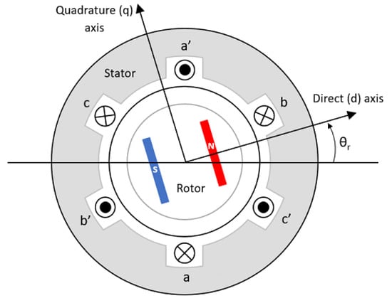 Modeling using FOC controller: Field-oriented controllers (FOCs) are designed to control the currents of synchronous motors. For continuous variables, the control is performed in rotary coordinates dq, and the two current components are handled separately by two independent controllers, one controlling the motor flux and the other the torque. For discrete controlled variables, control is performed in stator coordinates and the controlled variables are calculated separately for each current component [29,30].