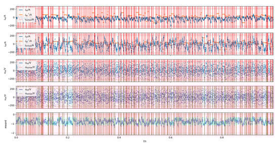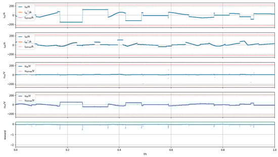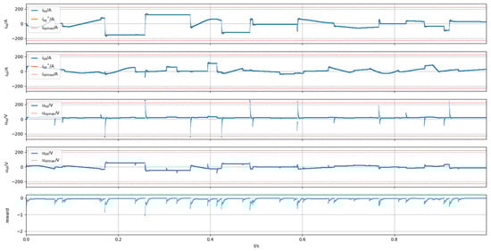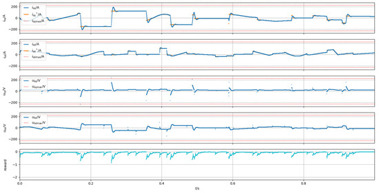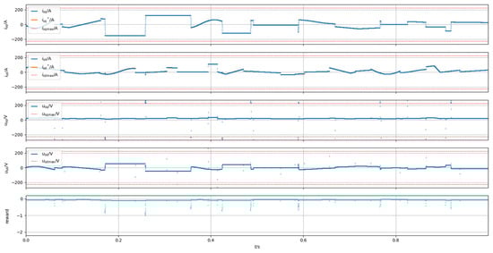 Figure 17 shows the simulation results of the MPC controller (Table 1), which is based on a neural network. The total reward was −480.7. This value surpasses the performance achieved by other types of controllers that have been used to control this system. The developed controller allows to effectively predict and correct the behavior of the electric motor, maintain its operation within the set parameters and significantly reduce deviations compared to classical controllers. During neural network training, cross-validation was employed to effectively prevent model overfitting. The vertical axis of the graph represents the motor’s dq-axis voltage, dq-axis current, and the obtained score, while the horizontal axis denotes time (in seconds).