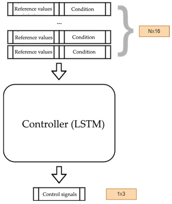 The hybrid model used in this paper combines two layers: LSTM and a full-channel layer (Figure 13). This type of architecture is used to build the controller interface. In this case, the current state of the motor and target parameters are taken as input, and control signals are output by the controller [2,35].