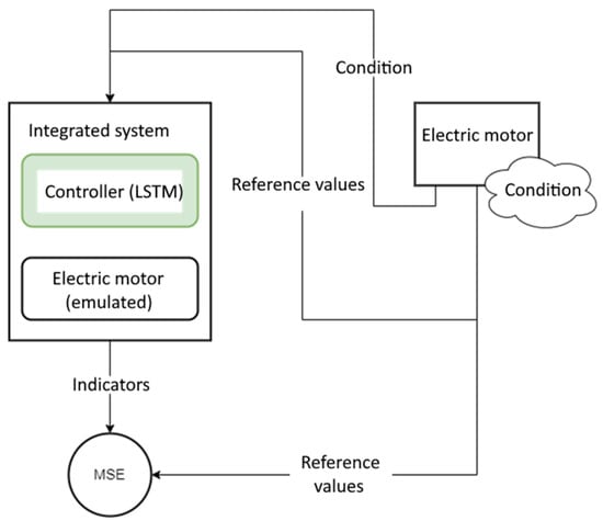 The model, which is based on an LSTM controller and a neural network to simulate motor operation, defines the initial conditions. The neural network is pre-trained to accurately reproduce the characteristics of the real motor and to support the error back propagation process. The target value of the drive current is then determined [3,36,37].