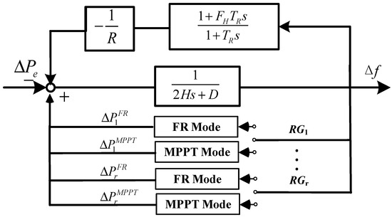 RGs can respond to the frequency drop by the additional control architecture for the frequency regulation, such as RoCoF loop and droop loop [2]. In this case, RGs can provide more output power than that in MPPT mode to support the system frequency by releasing the stored energy, such as the kinetic energy stored in rotating masses for wind turbines. Considering the RoCoF loop and droop loop for RGs, the increment of the RG output during the FR mode can be modeled as Equation (1).