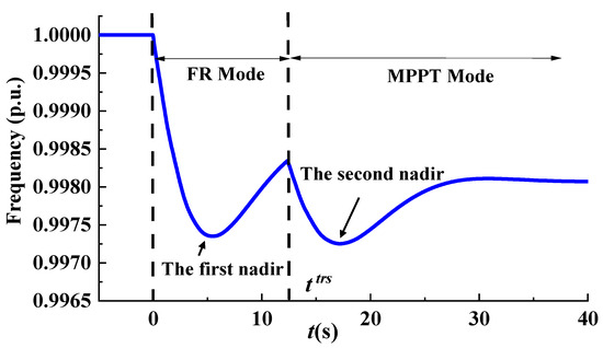 RGs can participate in frequency regulation (FR) by releasing the stored energy through additional control architecture, such as the rate of change in frequency (RoCoF) loop and droop loop [2,3,4]. However, once the frequency support from RGs is terminated, the control mode of RGs transits from the FR mode to the MPPT mode, so that the released energy of RGs can be restored. However, during the control mode transition process, the power outputs of RGs decline significantly, leading to the second frequency drop, which can be more serious than the first frequency drop [5]. Therefore, the control mode transition of RGs is highly relevant to the system frequency dynamics, which needs to be comprehensively considered in the system scheduling models.