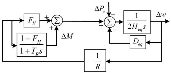 Next, the multi-governor response model can be aggregated into a single-governor model to reduce the model dimensionality [32]. Specifically, the equivalent parameter of H, R, and FH can be obtained by Equation (6), where and are the rated power of the SG g and RG w, respectively. Then, the aggregated single-machine model can be generated as shown in Figure 2.