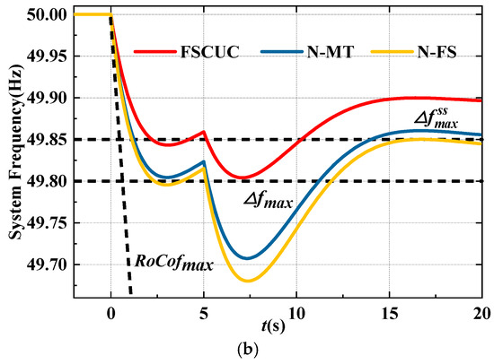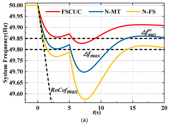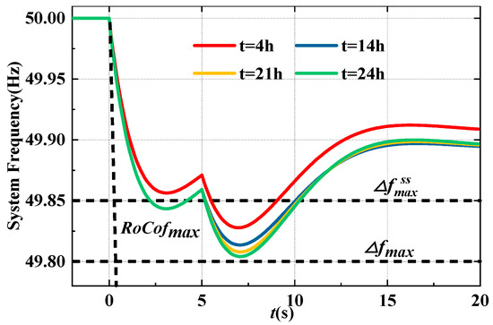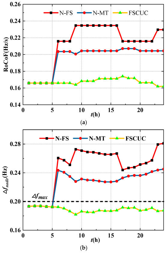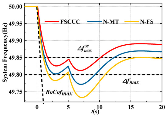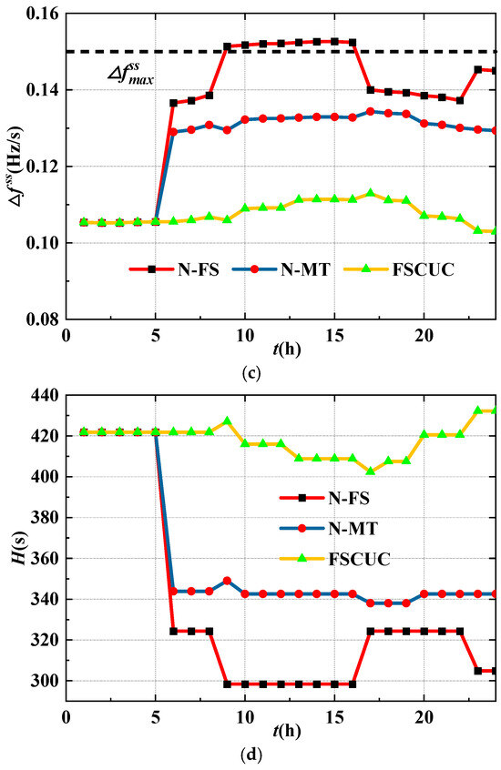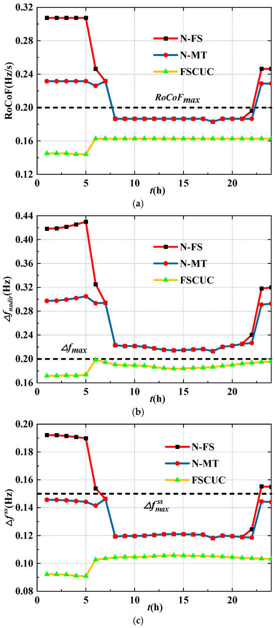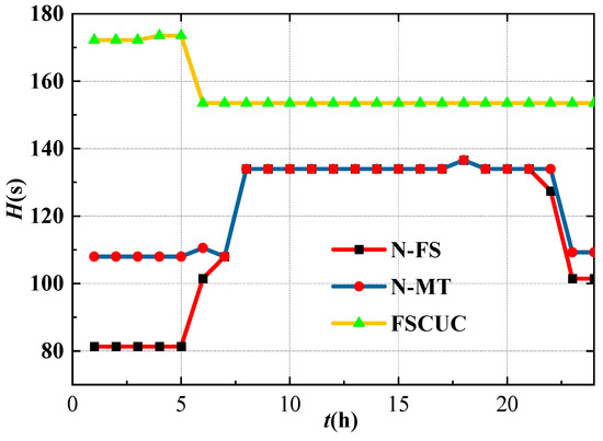 Subsequently, the proposed FSCUC model is compared with the existing method to validate the superiority, including the traditional UC model without frequency constraints (N-FS) [9] and without control mode transition (N-MT) [22]. The comparison of operational costs and frequency indices are shown in Table 3 and Figure 8, and the improvement of frequency indices and inertia compared to the N-FS model is provided in Table 4. It can be seen that the limits on the frequency indices are violated in the N-FS model, and limits on RoCoF and frequency nadirs are not guaranteed in the N-MT model. In contrast, limits on all frequency indices can be strictly met in the proposed FSCUC model with the additional costs of only 0.66%. Moreover, frequency indices and inertia can be improved by 53%, 59%, 52%, and 113% at most, respectively, as shown in Table 4. Hence, the superiority of the proposed method to address the frequency stability can be demonstrated.